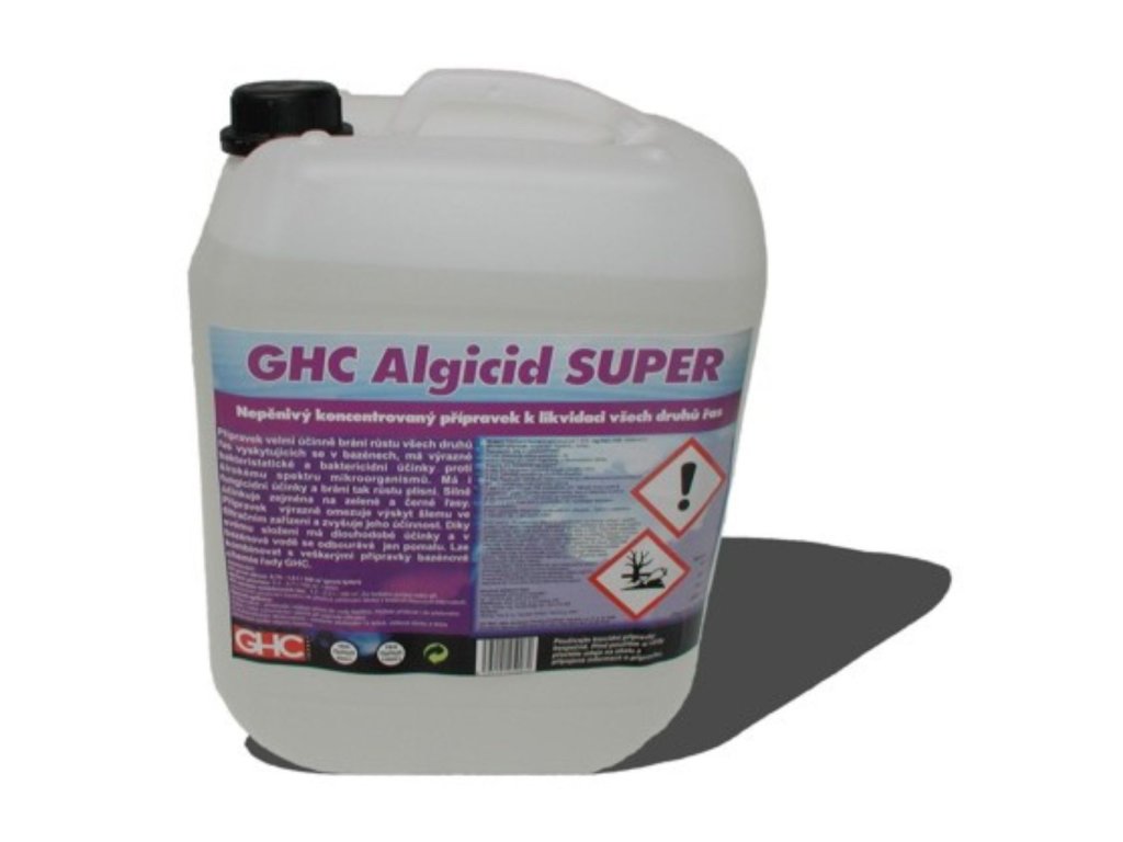 GHC Algicid SUPER je maximálne účinný tekutý prípravok proti rastu rias v bazéne. Prípravok je určený pre veľké verejné bazény, predovšetkým v letných mesiacoch, pri vyšších teplotách vzduchu a pri veľkom výskyte vštkých druhov rias, ktoré zahubí a zabráni v raste a množení sa. Vďaka svojmu zloženiu má dlhodobé účinky a v bazénovej vode sa odbúrava len pomaly. Prípravok je najvhodnejšie dávkovať priamo do bazénu a na miesta, kde sa nachádza najväčšia koncentrácia rias.