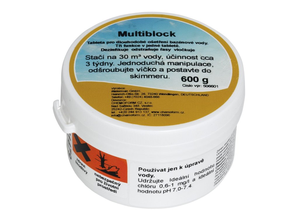 Multifunkční tableta 600 g vydrží v bazénu o 30 m3 cca 3 týdny. Dezinfikuje, je prevencí výskytu řas, vločkuje. Stabilizovaná pro všechny stupně tvrdosti vody.Dodatočné parametre