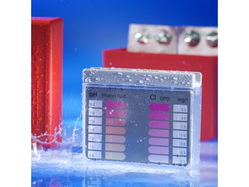 Bazénový tester na analýzu obsahu chlóru a hodnoty pH v bazénovej vode. Pridaním reagenčnej tablety sa vzorka vody z bazéna sfarbí do určitého odtieňa podľa koncentrácie chlóru alebo hodnoty pH vo vode. Podľa porovnávacej škály na testri sa potom odpočíta príslušná hodnota.